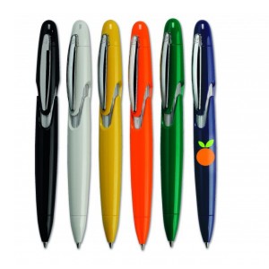 Stylo-bille à poussoir avec boîtier en opaque brillant. Poussoir, clip et pointe lourde en métal brillant.